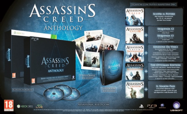 Assassin’s Creed Anthology contiene tutti i pacchetti aggiuntivi e i DLC rilasciati nel corso del tempo per i diversi giochi, anche il Season Pass per Assassin’s Creed 3, necessario – come sapete – per accedere ai prossimi contenuti scaricabili; come se non bastasse, la raccolta include anche una custodia speciale per racchiudere tutti gli episodi e ben cinque litografie.