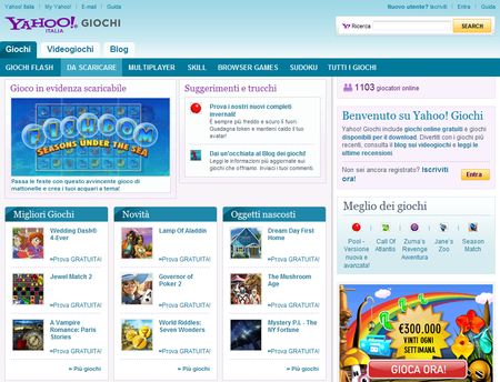 La sezione del portale Yahoo con tanti videogames da provare in forma gratuita. La suddivisione della prima pagina del portale consente di trovare facilmente ciò che si cerca e di esplorare le varie categorie del sito (puzzle, passatempo, azione…) oltre a vedere immediatamente le ultime novità e i migliori videogiochi, quelli maggiormente apprezzati dagli utenti.