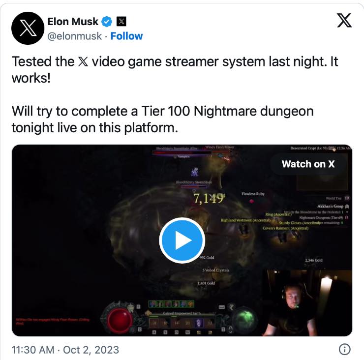 Continua la rivoluzione su X, a breve sarà possibile per i videogiocatori pubblicare dei live streaming delle proprie sessioni. Il primo a farlo è stato proprio Musk, nella clip condivisa sul suo social network in cui gioca a Diablo IV; l’ennesimo step verso un’applicazione tuttofare, o come l’ha definita lo stesso imprenditore: l’app per tutto. “Ho testato il nuovo sistema di streaming di X ieri notte. Funziona!”, scrive nel post sorprendendo più di qualche seguace – nonostante le sue intenzioni fossero già note.