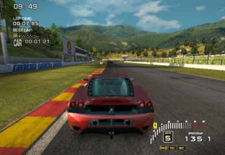 Il primo impatto con Ferrari Challenge è senza dubbio positivo: un menu molto evocativo, con un modello di Ferrari che scorre in background, riprodotto con poligonal maestria, e canti gotici di sottofondo. Tante le opzioni a disposizione, dove per fortuna le modalità di guida vera e propria sono raccolte nella prima disponibile. Si parte con l’allenamento, sul circuito del Mugello accompagnato da una voce guida che ci illustra le tecniche di base. A fine prova, ci becchiamo una “pagella” che riporta in centesimi i punteggi conseguiti sotto vari profili (uso dell’acceleratore, dei freni, impostazione delle curve). Intrigante e divertente, questa introduzione ci terrà occupati per una buona mezz’ora (forse anche più) a cercare di limare i secondi e con essi incrementare i punteggi ottenuti.