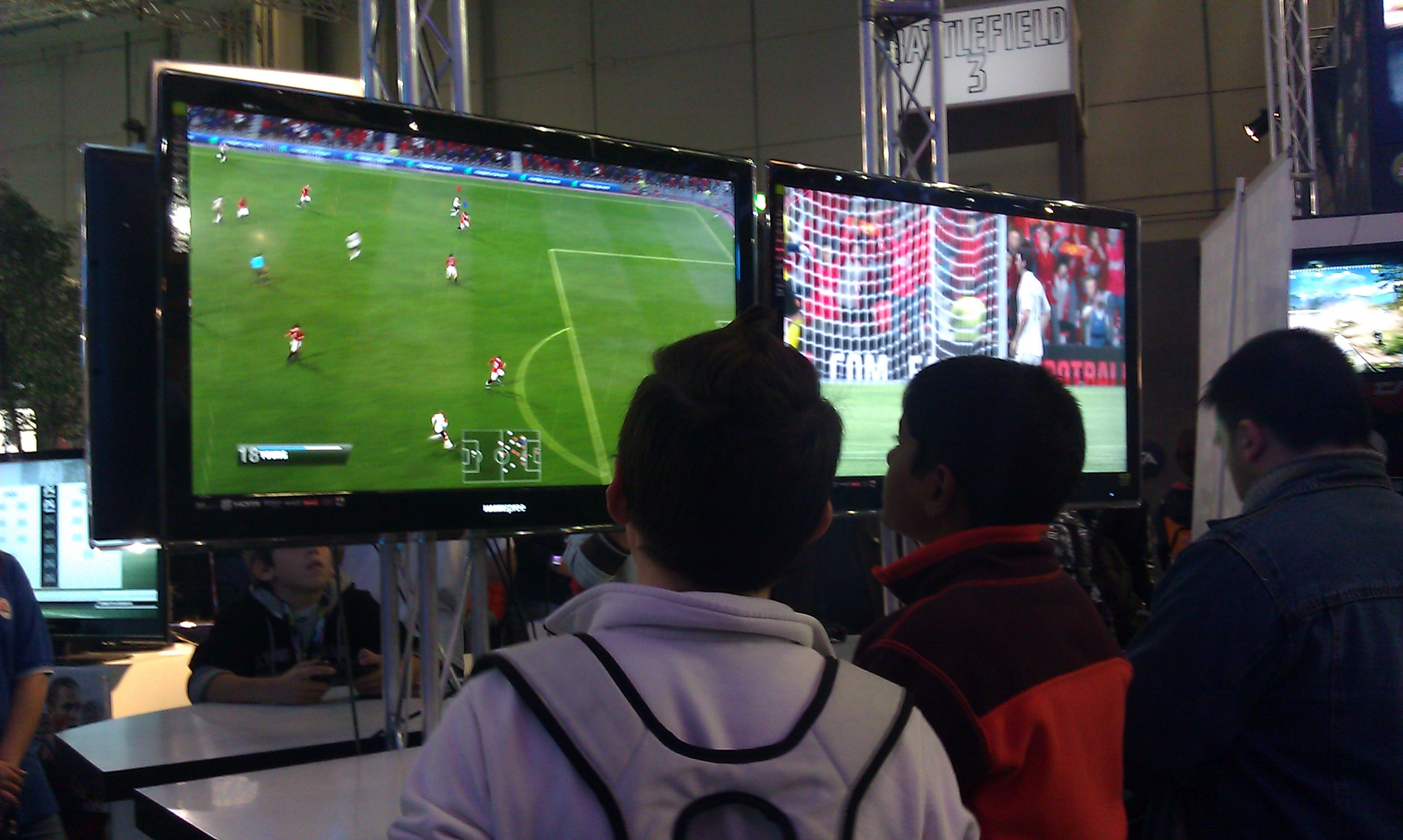Moltissimo pubblico interessato ai gadget di The Sims allo stand di Electronic Arts. Una Lamborghini bianca indicava la parte dedicata a Need For Speed: The Run, presente con molte postazioni di prova. Troppo poco lo spazio dedicato al nuovo capitolo di Mass Effect 3 (solo 2 postazioni, di cui una con televisione non funzionante, sigh), mentre decisamente carina l’abitazione distrutta (con sassi e calcinacci sul pavimento) che ospitava per la prova di BattleField 3. Poi tutto il reparto sport: Fifa 12, Grand Slam Tennis 2, SSX. E quest’ultimo è stato un po’ una delusione. L’eliminazione di “Deadly Descent” dal nome mi puzzava, ma l’impressione era che mancava la velocità, l’adrenalina, quello stile arcade che tanto ho apprezzato nei vecchi.. Ma sono fiducioso che era colpa solo della limitata scelta di percorsi, di personaggi non potenziati, dell’assenza di un help per ricordarmi i comandi (dopo anni di oblio senza discese a rotta di collo sulla neve), della colonna sonora impossibile da ascoltare causa troppo casino.