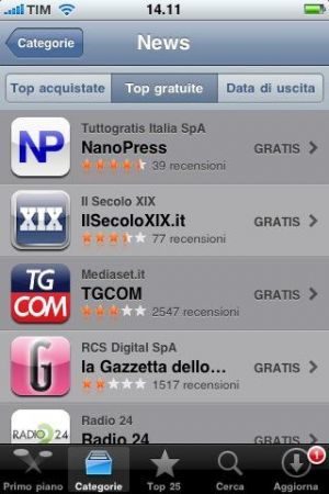 Sono passati cinque giorni da quando è stata messa a disposizione di tutti gli utenti possessori di iPhone o di iPod Touch la nuovissima applicazione di Nanopress che permette di leggere tutte le news dei blog del network. E dopo cinque giorni l’app è balzata al primo posto nella categoria News del grande Store di Apple per il voto di qualità assegnato dagli utenti, calcolato in base ai download effettuati e alle recensioni scritte da chi ha scaricato l’applicazione fino a questo momento. Come si vede dall’immagine in alto a questa notizia l’app di Nanopress è la prima in classifica.