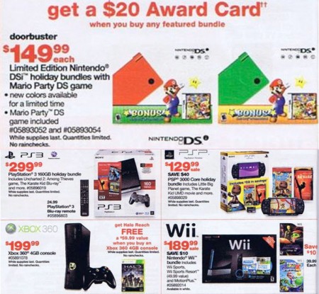 Siamo ancora a novembre, ma i giochi per Natale, i regalini da spartire a destra e manca, le sorprese da fare alla nostra dolce metà sono già nei nostri pensieri assieme all’immagine di un portafoglio rinsecchito. Povero lui! Come potete ben vedere in foto – l’immagine è abbastanza chiara – SONY, Nintendo e Microsoft hanno iniziato a diffondere i primi volantini, quelli che, ogni anno, catalizzano l’attenzione di migliaia e migliaia di fan di tutte le età. Si tratta di offerte disponibili negli Stati Uniti, ma saranno proposte anche qui, ne siamo certi. D’altronde, gli americani iniziano prima con lo shopping, subito dopo il giorno del ringraziamento, in occasione del Black Friday, il Venerdì Nero.