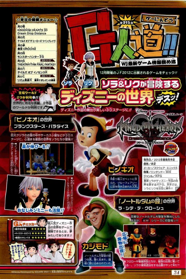 Square ha presentato Pinocchio, per esempio. Ma il burattino non fece già la sua comparsa in Kingdom Hearts Chain of Memories, tanto per citare il primo che ci viene in mente? Per fortuna, non ha fatto lo stesso errore con Il Gobbo di Notre Dame, che ci permetterà di conoscere da vicino Quasimodo, Esmeralda e Frollo, personaggi mai apparsi, correggeteci se sbagliamo, nel corso di tutta la serie. Gli sviluppatori, comunque, hanno annunciato anche la presenza di altri mondi Disney, sui quali, però, non si sono ‘sbottonati’.