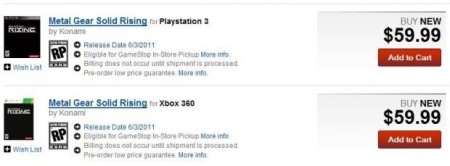 Notizia recentissima: Metal Gear Rising ha una data di rilascio, o almeno così sembra. Non c’è ancora nulla di ufficiale, ma dubitiamo che, dopo la svista di GameStop, se di svista si può parlare, i diretti interessati non decidano di far luce sui tempi dell’atteso capitolo della serie Metal Gear. Una inserzione, risalente a pochi giorni fa, ha fatto il giro di tutto il Nuovo Continente: mette in evidenza – potete vederlo attraverso lo screenshot – il prezzo delle due versioni, quella PS3 e quella Xbox 360, entrambe vendute a 59.99 euro.