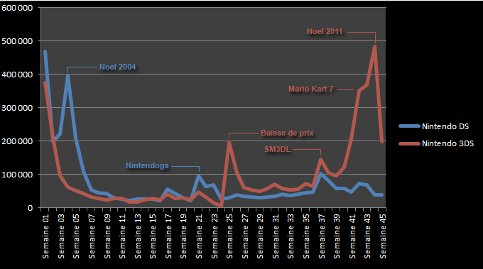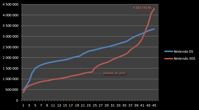 Quelli di Nintendo Master hanno voluto spiegare perché Nintendo 3DS, la nuova console portatile della grande N, sta avendo e avrà molto più successo rispetto al predecessore, e, attraverso una serie di grafici, ci sono riusciti benissimo. La storia delle due console non è affatto paragonabile, dovreste saperlo tutti ormai; se, infatti, Nintendo DS ha venduto molto di più agli inizi rispetto a 3DS, e così è stato fino ad agosto, dopo la drastica riduzione dei prezzi tutto è cambiato. La formula magica si basa su tre parole: price-cut, Mario e Monster Hunter! Così la redazione ha descritto la ricetta che la compagnia ha utilizzato per superare i quattro milioni di unità vendute.