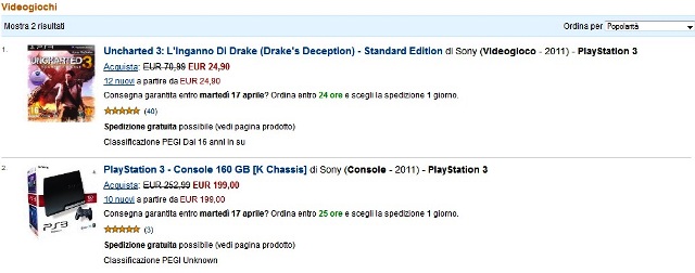 La PlayStation 3 da 160 GB, infatti, è venduta a circa 199 euro, una sessantina in meno rispetto al prezzo originale (252.99); non è, tra l’altro, l’unica offerta di cui vi conviene approfittare: chi non ha ancora avuto modo di provare la meravigliosa avventura di Nathan Drake in Uncharted 3 troverà senz’altro conveniente acquistarla a soli 24.90 euro, visto che il prezzo ufficiale supera, come vi abbiamo già anticipato, i settanta. Dovrete pagare, ovviamente, le spese di spedizione (che in genere sono abbastanza elevate), ma Amazon specifica che è anche possibile evitarle, attraverso particolari procedure. Se non volete rimanere con le mani in mano, affrettatevi! L’offerta, infatti, è limitata non soltanto nel tempo: le copie disponibili non sono infinite.