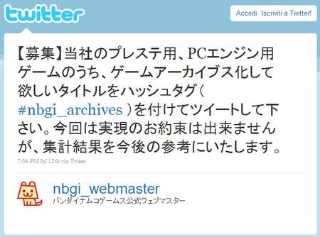 Chiunque, con l’unica necessità di avere conoscenza della lingua, può esprimere la propria preferenza al riguardo in un modo molto semplice. Ogni utente potrà dire la sua semplicemente collegandosi al profilo su Twitter di Namco Bandai, dove è stata posta dal publisher la richiesta.